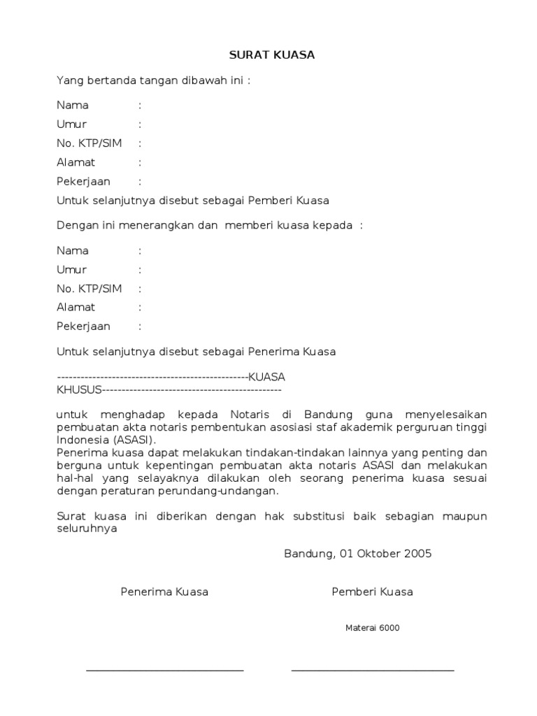 Saya yang bertanda tangan di bawah ini : Sekedar berbagi pelajaran melalui vidiosangatlah bosan rasnya jika harus belajar mengaplikasikan dengan membaca saja. Surat kuasa ialah sebuah surat berisikan informasi perihal wewenang seseorang untuk melakukan tindakan atas nama pemberi kuasa. Surat tersebut dinamakan surat kuasa. Afrikaans albanian arabic bengali chinese croatian czech danish dutch english finnish french german greek hindi hungarian icelandic indonesian italian japanese korean latin malay malayalam marathi nepali. Contoh surat resmi sekolah english these pictures of this page are about:surat kuasa in. Jadi surat kuasa adalah surat surat yang berisi pelimpahan kuasa dari satu orang kepada orang lain untuk melakukan sesuatu hal mewakili orang yang memberi pelimpahan wewenang tersebut. Example of the power of attorney. Surat kuasa dibuat oleh seseorang yang memiliki kesibukan atau halangan tertentu dan diberikan kepada orang lain yang terpercaya dikarenakan yang bersangkutan tidak dapat melakukan suatu hal. Kondisi yang tidak menentu terkadang membuat kita tidak sanggup menghadiri urusan penting. Surat kuasa is another standard letter used in indonesian correspondence. Apabila anda hendak melakukan pindah kuasa dan belum mengerti pembuatannya, contoh surat kuasa berikut ini dapat membantu anda. In indonesia neither the drafter nor the receiver of the power of attorney needs to be a lawyer.